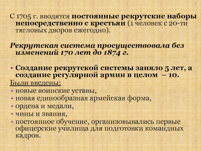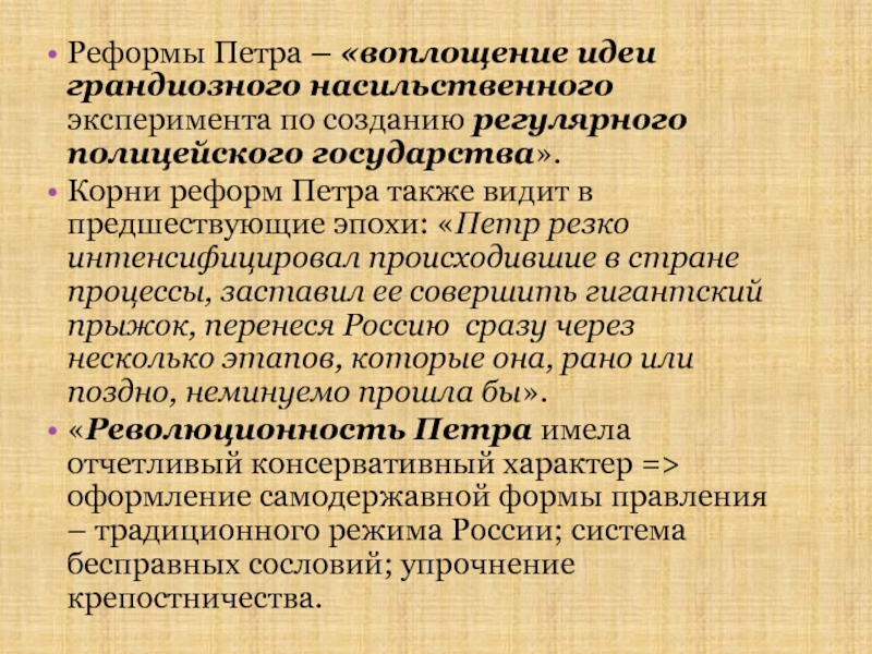 «Революционность Петра имела отчетливый консервативный характер оформление самодержавной формы правления – традиционного режима России; система бесправных сословий; упрочнение крепостничества.