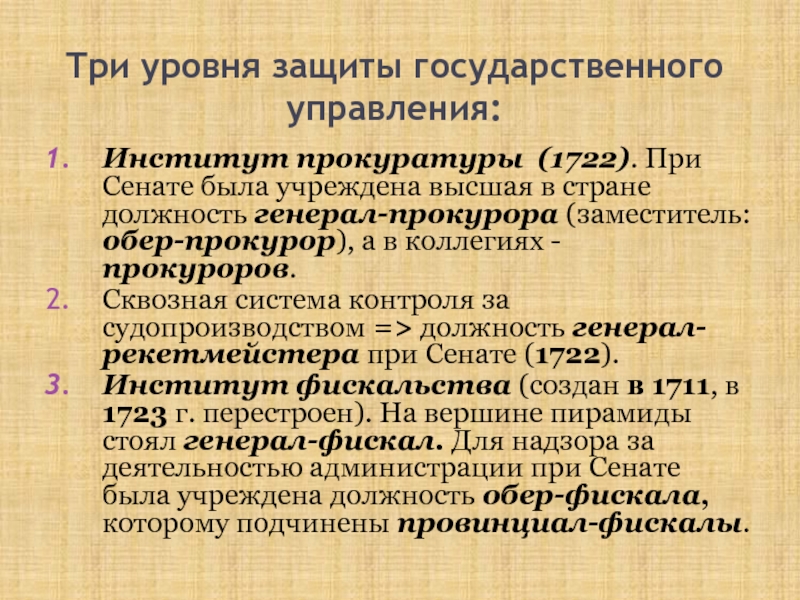 Институт фискальства (создан в 1711, в 1723 г. перестроен). На вершине пирамиды стоял генерал-фискал. Для надзора за деятельностью администрации при Сенате была учреждена должность обер-фискала, которому подчинены провинциал-фискалы.