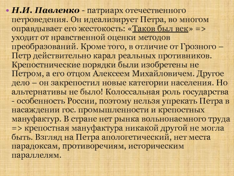 Слайд 10Н.И. Павленко - патриарх отечественного петроведения. Он идеализирует Петра, во