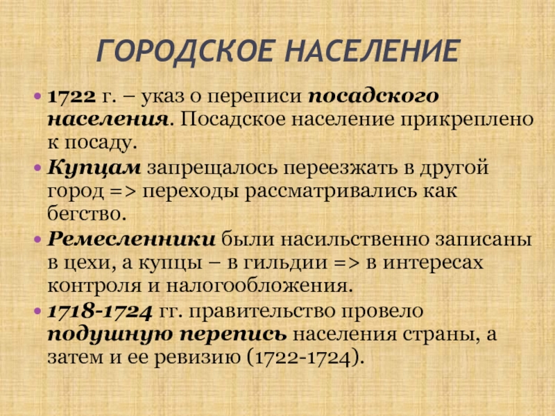 1722 г. – указ о переписи посадского населения. Посадское