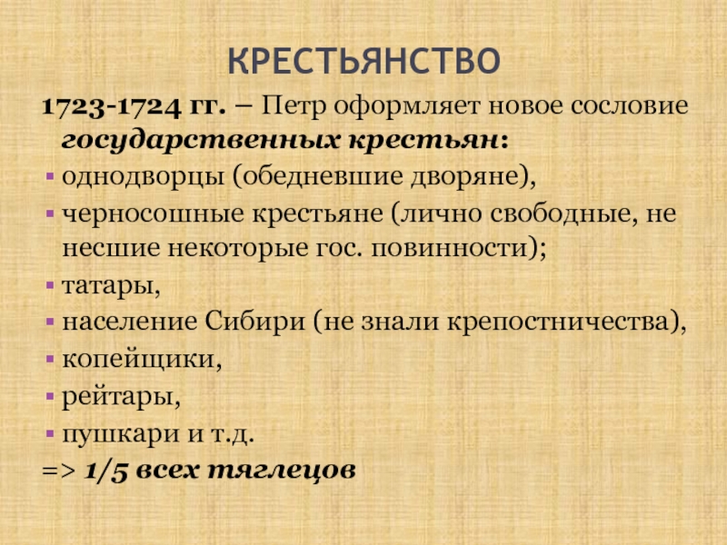 1723-1724 гг. – Петр оформляет новое сословие государственных крестьян: