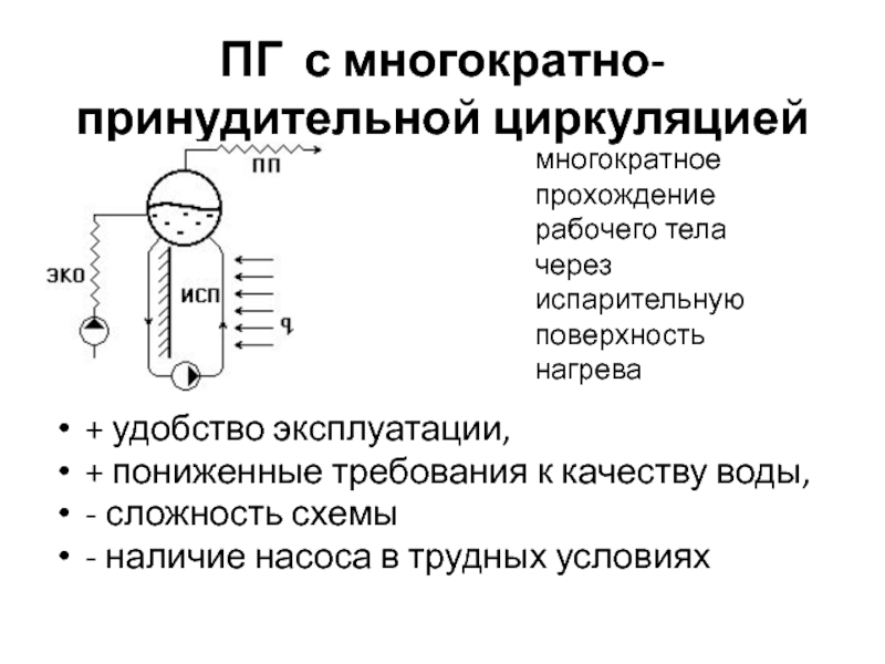 + удобство эксплуатации,+ пониженные требования к качеству воды,- сложность схемы- наличие насоса в трудных условияхПГ с многократно-принудительной циркуляциеймногократное прохождение рабочего тела через испарительную поверхность нагрева