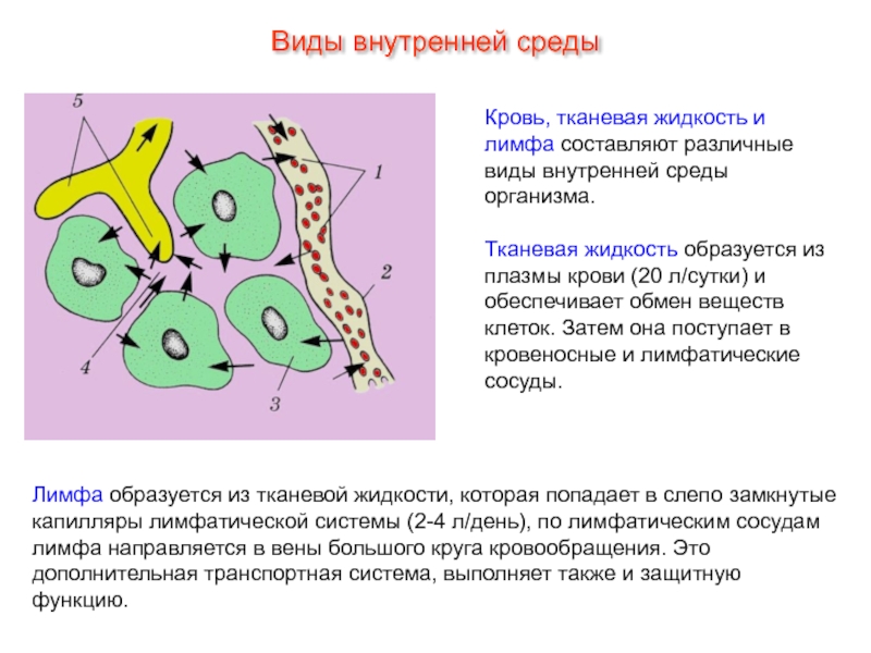 Лимфа образуется из тканевой жидкости, которая попадает в слепо замкнутые капилляры лимфатической системы (2-4 л/день), по лимфатическим сосудам лимфа направляется в вены большого круга кровообращения. Это дополнительная транспортная система, выполняет также и защитную функцию.