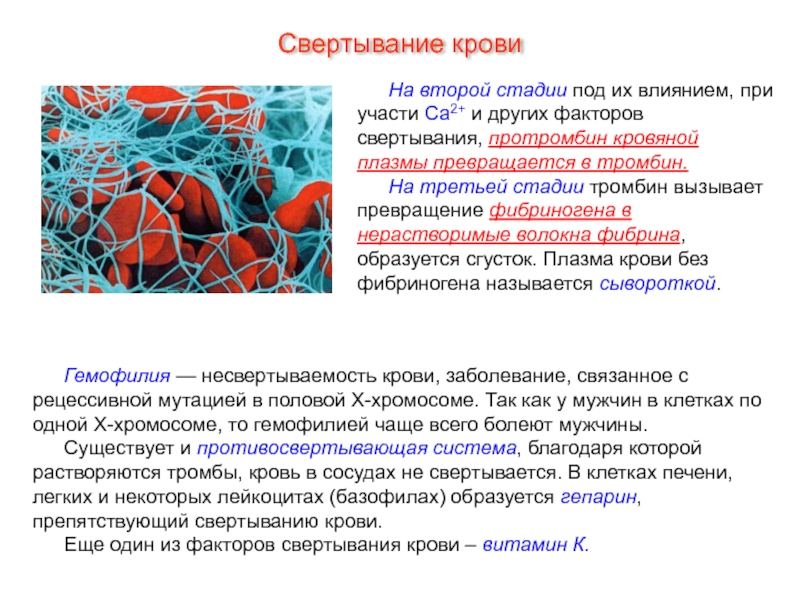 Существует и противосвертывающая система, благодаря которой растворяются тромбы, кровь в сосудах не свертывается. В клетках печени, легких и некоторых лейкоцитах (базофилах) образуется гепарин, препятствующий свертыванию крови.