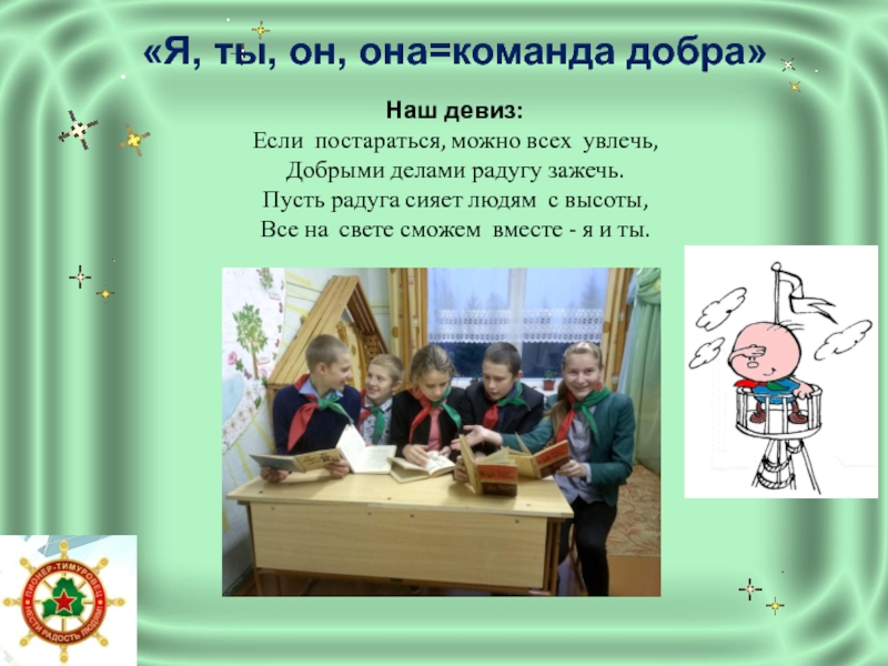 :«Я, ты, он, она=команда добра»Наш девиз: Если постараться, можно всех увлечь,Добрыми делами радугу зажечь.Пусть радуга сияет людям