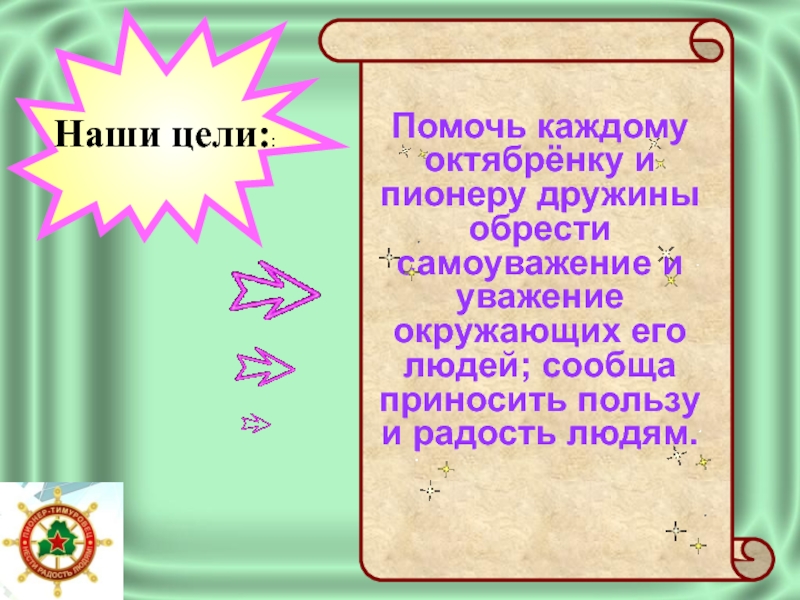 Помочь каждому октябрёнку и пионеру дружины обрести самоуважение и уважение окружающих его людей; сообща приносить пользу и радость людям. Наши цели::