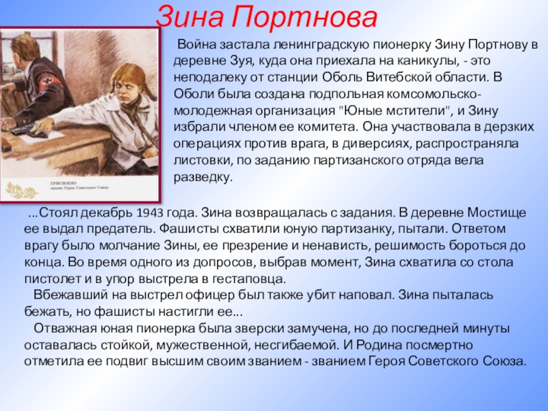 ...Стоял декабрь 1943 года. Зина возвращалась с задания. В деревне Мостище ее выдал предатель. Фашисты схватили юную партизанку, пытали. Ответом врагу было молчание Зины, ее презрение и ненависть, решимость бороться до конца. Во время одного из допросов, выбрав момент, Зина схватила со стола пистолет и в упор выстрела в гестаповца.