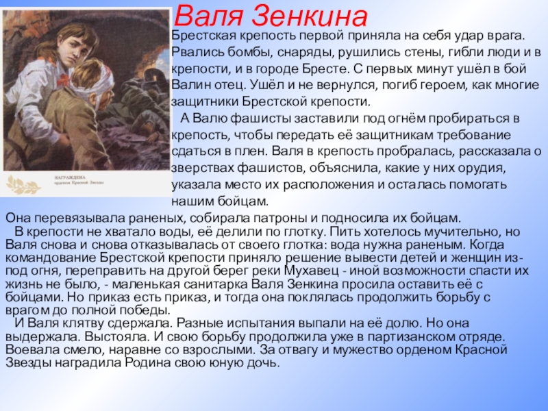 В крепости не хватало воды, её делили по глотку. Пить хотелось мучительно, но Валя снова и снова отказывалась от своего глотка: вода нужна раненым. Когда командование Брестской крепости приняло решение вывести детей и женщин из-под огня, переправить на другой берег реки Мухавец - иной возможности спасти их жизнь не было, - маленькая санитарка Валя Зенкина просила оставить её с бойцами. Но приказ есть приказ, и тогда она поклялась продолжить борьбу с врагом до полной победы.