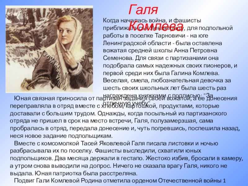 Когда началась война, и фашисты приближались к Ленинграду, для подпольной работы в поселке Тарновичи - на юге Ленинградской области - была оставлена вожатая средней школы Анна Петровна Семенова. Для связи с партизанами она подобрала самых надежных своих пионеров, и первой среди них была Галина Комлева. Веселая, смела, любознательная девочка за шесть своих школьных лет была шесть раз награждена книжками с подписью: "За отличную учебу"