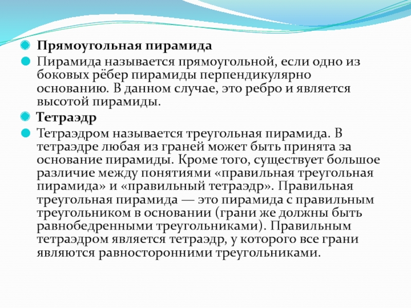 Тетраэдром называется треугольная пирамида. В тетраэдре любая из граней может быть принята за основание пирамиды. Кроме того, существует большое различие между понятиями «правильная треугольная пирамида» и «правильный тетраэдр». Правильная треугольная пирамида — это пирамида с правильным треугольником в основании (грани же должны быть равнобедренными треугольниками). Правильным тетраэдром является тетраэдр, у которого все грани являются равносторонними треугольниками.