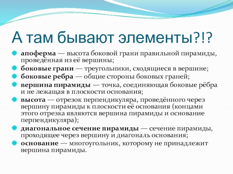 А там бывают элементы?!?апоферма — высота боковой грани правильной пирамиды, проведённая из её вершины;боковые грани — треугольники, сходящиеся в