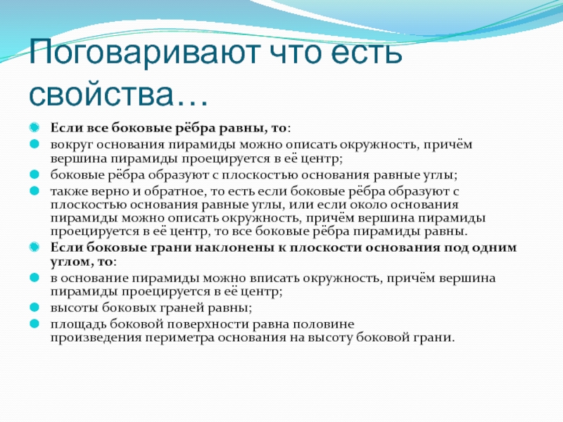 Поговаривают что есть свойства…Если все боковые рёбра равны, то:вокруг основания пирамиды можно описать окружность, причём вершина пирамиды