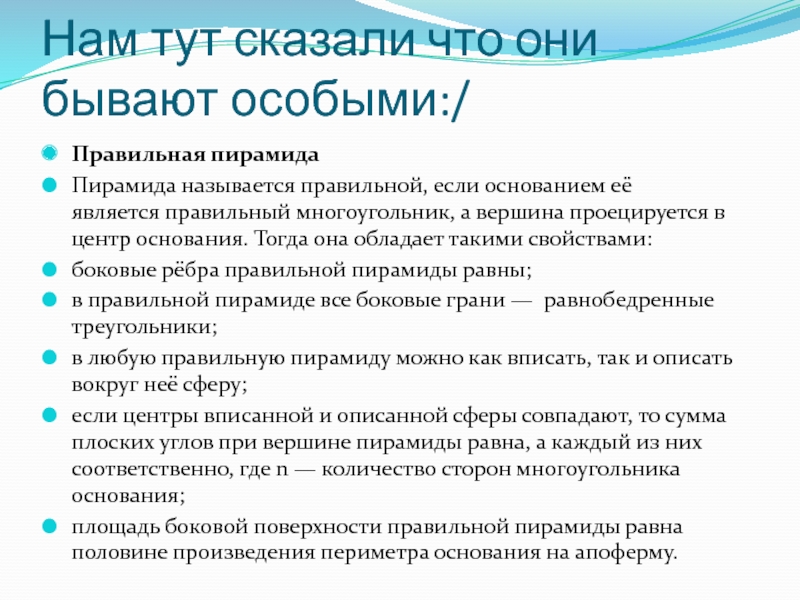 Нам тут сказали что они бывают особыми:/ Правильная пирамидаПирамида называется правильной, если основанием её является правильный многоугольник, а