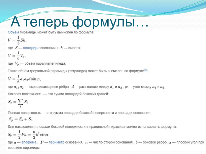 Что же это такое?!?Пирамида — многогранник, одна из граней которого (называемая основанием) — произвольный многоугольник, а остальные грани (называемые боковыми гранями) — треугольники, имеющие общую вершину. По числу углов основания различают пирамиды треугольные , четырёхугольные и т. д. Пирамида является частным
