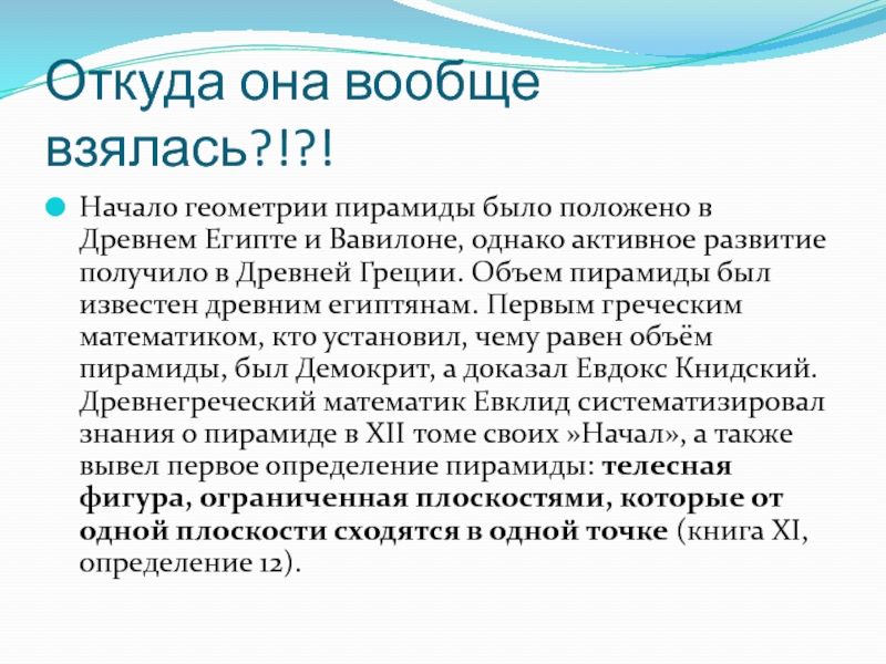 Откуда она вообще взялась?!?!Начало геометрии пирамиды было положено в Древнем Египте и Вавилоне, однако активное развитие получило