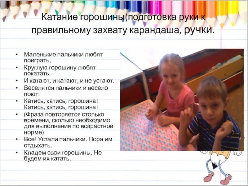 Слайд 7Катание горошины(подготовка руки к правильному захвату карандаша, ручки.