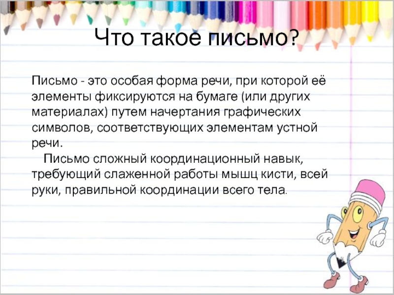 Письмо сложный координационный навык, требующий слаженной работы мышц кисти, всей руки, правильной координации всего тела.