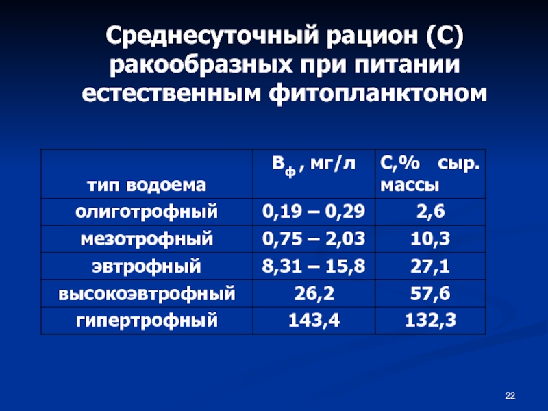 Слайд 22Среднесуточный рацион (С) ракообразных при питании