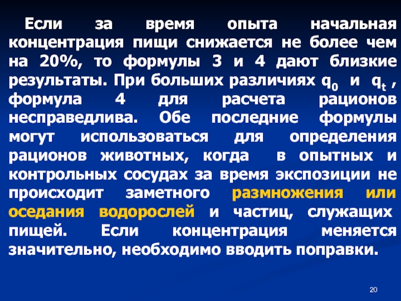 результаты. При больших различиях q0 и qt , формула 4 для расчета рационов несправедлива. Обе последние формулы могут использоваться для определения рационов животных, когда в опытных и контрольных сосудах за время экспозиции не происходит заметного размножения или оседания водорослей и частиц, служащих пищей. Если концентрация меняется значительно, необходимо вводить поправки.