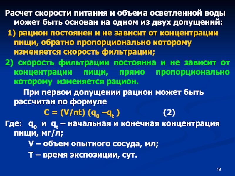 контрольном и опытном сосудах. Скорость питания (рацион), скорость фильтрации и средняя концентрация пищи связаны между собой простой зависимостью