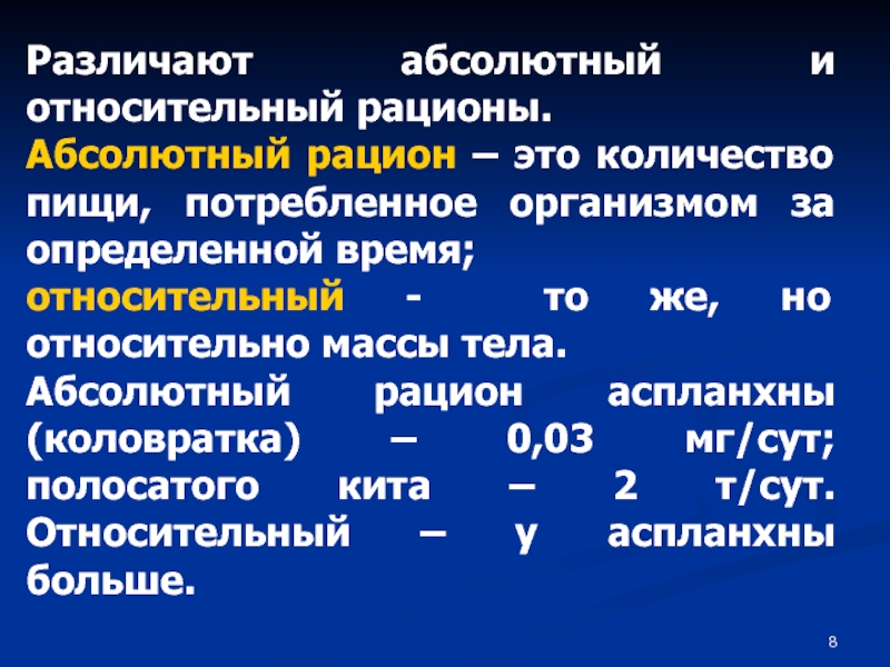 Абсолютный рацион аспланхны (коловратка) – 0,03 мг/сут; полосатого кита – 2 т/сут. Относительный – у аспланхны больше.