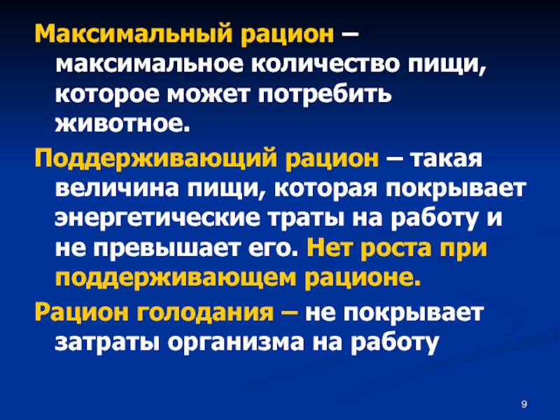 Слайд 9Максимальный рацион – максимальное количество пищи, которое может потребить животное.