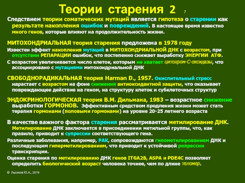 СВОБОДНОРАДИКАЛЬНАЯ теория Harman D., 1957. Окислительный стресс нарастает с возрастом на фоне снижения антиоксидантной защиты, что оказывает повреждающее действие на геном, на структуру клеток и субклеточных структур
