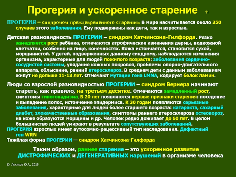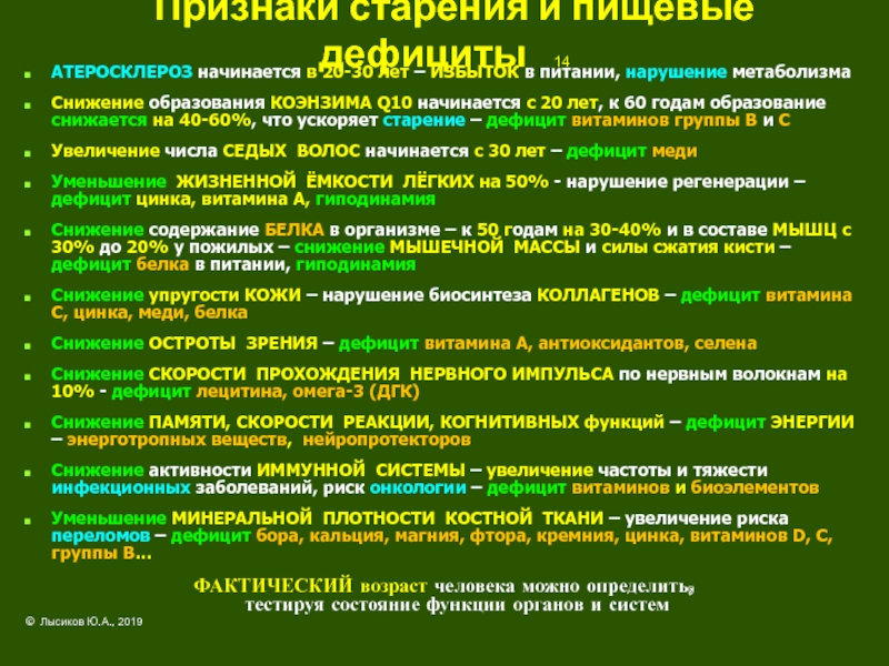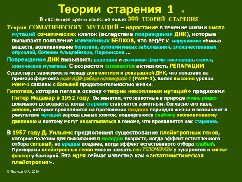 мутаций соматических клеток (вследствие повреждения ДНК), которые вызывают появление изменённых БЕЛКОВ, что ведёт к нарушению обмена веществ, возникновение болезней, аутоиммунных заболеваний, злокачественных опухолей, болезни Альцгеймера, Паркинсона …