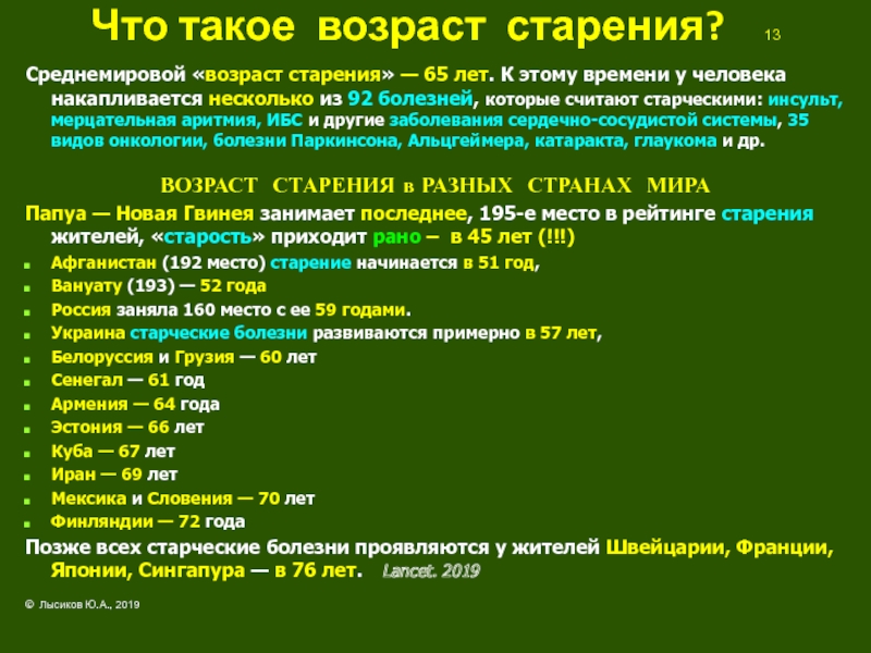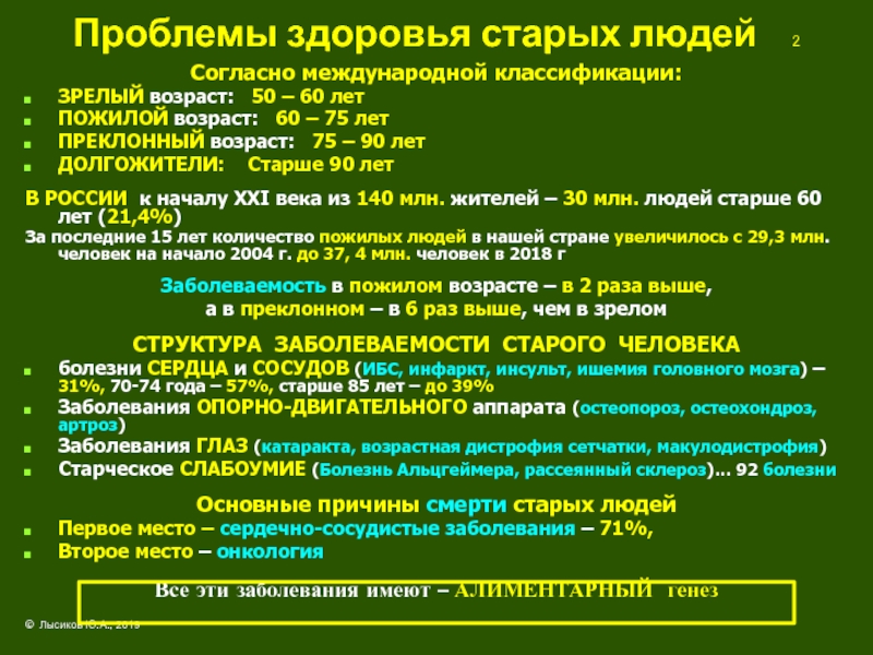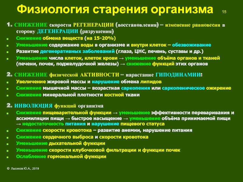 УВЕЛИЧЕНИЕ ЧИСЛА БОЛЕЗНЕЙ (включая инфекционные и травмы) с возрастом, что приводит к СНИЖЕНИЮ ФУНКЦИЙ жизненно важных органов