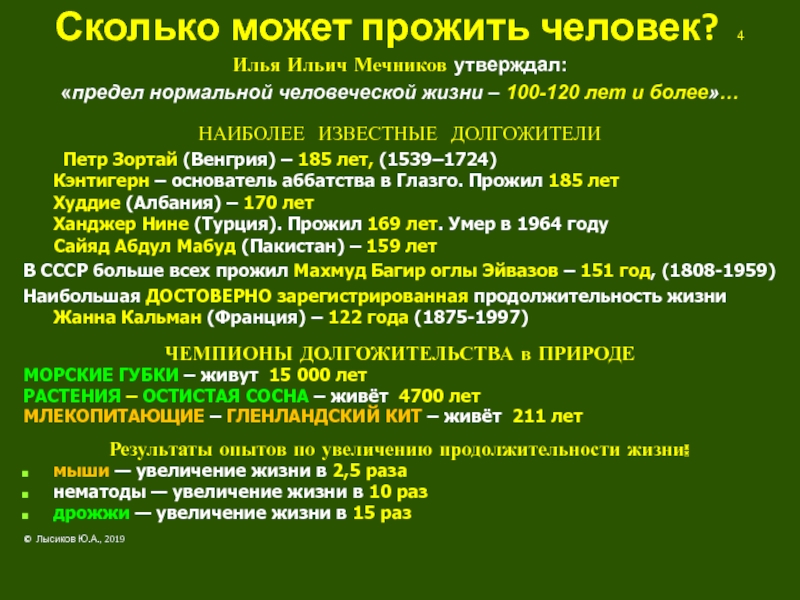 Наибольшая ДОСТОВЕРНО зарегистрированная продолжительность жизни Жанна Кальман (Франция) – 122 года (1875-1997)