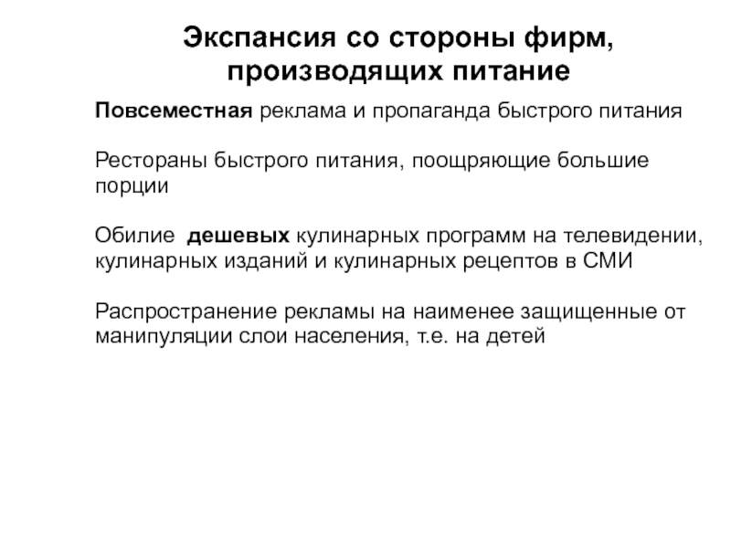 Слайд 10Экспансия со стороны фирм, производящих питание