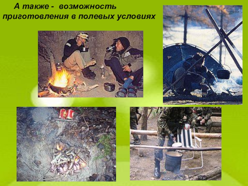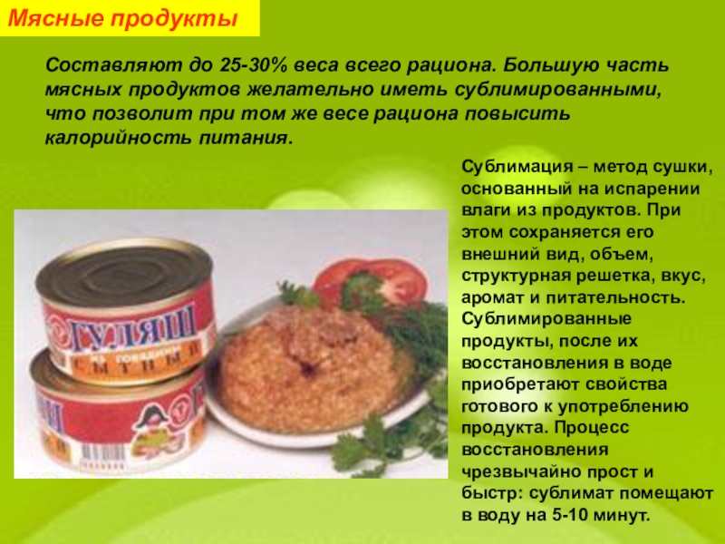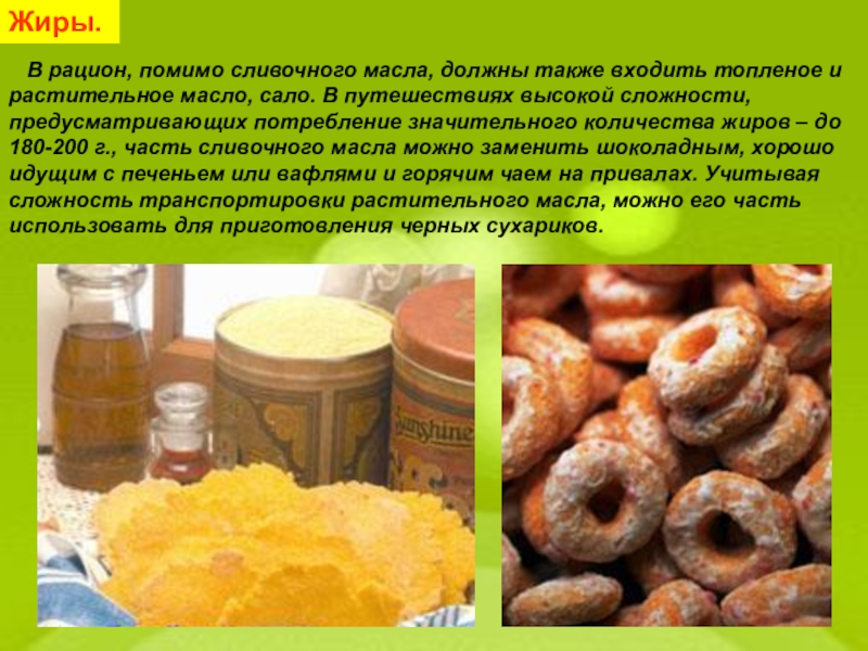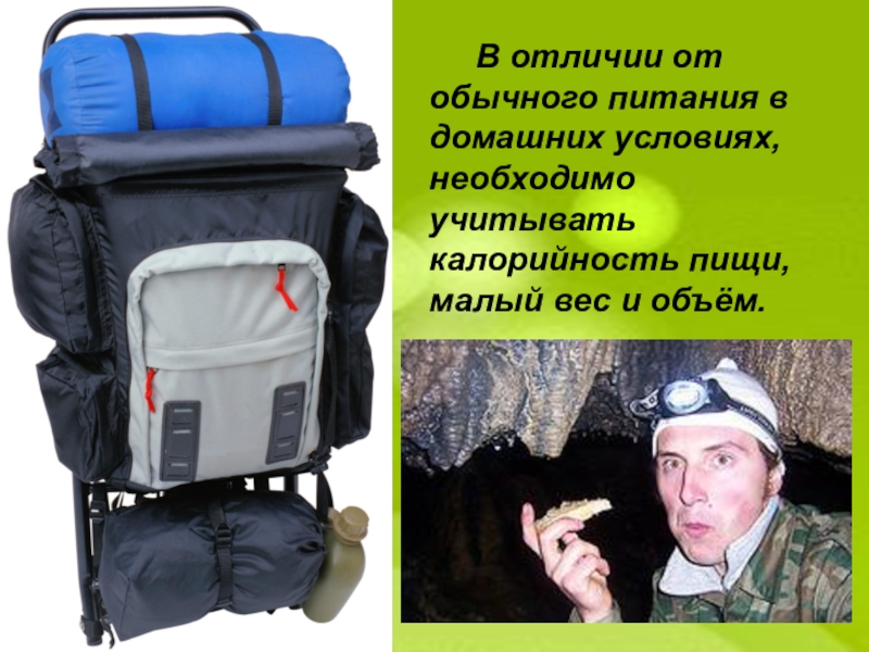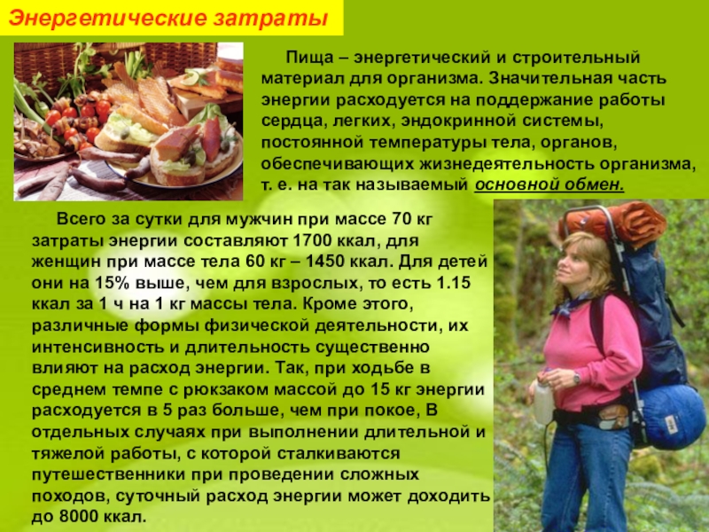 эндокринной системы, постоянной температуры тела, органов, обеспечивающих жизнедеятельность организма, т. е. на так называемый основной обмен. Всего за сутки для мужчин при массе 70 кг затраты энергии составляют 1700 ккал, для женщин при массе тела 60 кг – 1450 ккал. Для детей они на 15% выше, чем для взрослых, то есть 1.15 ккал за 1 ч на 1 кг массы тела. Кроме этого, различные формы физической деятельности, их интенсивность и длительность существенно влияют на расход энергии. Так, при ходьбе в среднем темпе с рюкзаком массой до 15 кг энергии расходуется в 5 раз больше, чем при покое, В отдельных случаях при выполнении длительной и тяжелой работы, с которой сталкиваются путешественники при проведении сложных походов, суточный расход энергии может доходить до 8000 ккал.