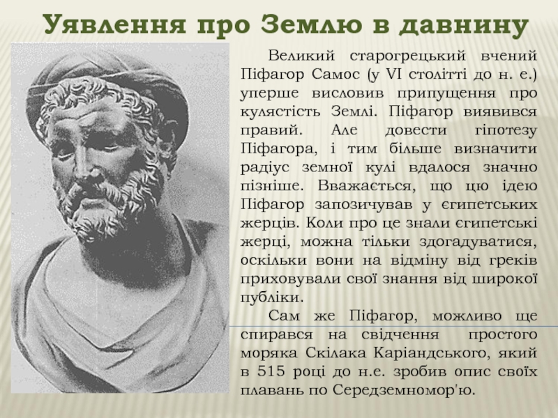 Уявлення про Землю в давнину	Великий старогрецький вчений Піфагор Самос (у VI столітті до н. е.) уперше висловив