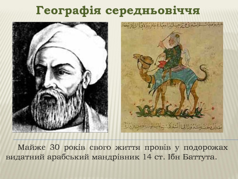 Географія середньовіччя	Майже 30 років свого життя провів у подорожах видатний арабський мандрівник 14 ст. Ібн Баттута.