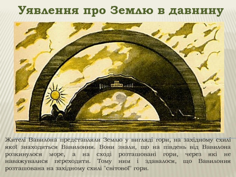 Уявлення про Землю в давнинуЖителі Вавилона представляли Землю у вигляді гори, на західному схилі якої знаходиться Вавилония.