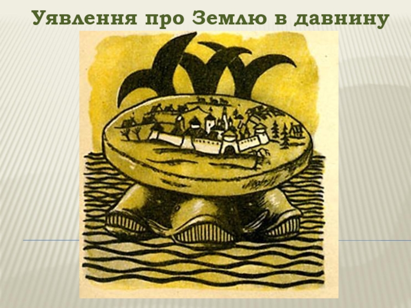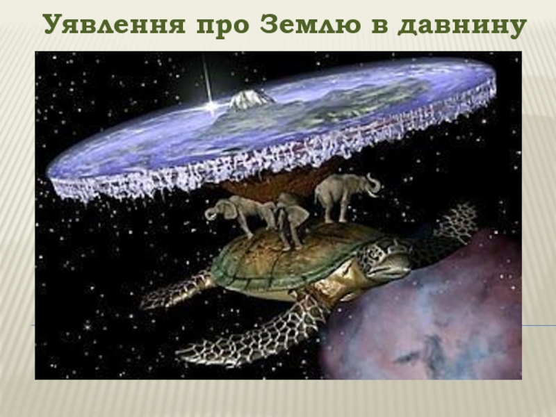Уявлення про Землю в давнину Древні індійці представляли Землю у вигляді півсфери, яку тримають чотири слони. Слони стоять на величезній черепасі, а черепаха на змії, яка, згорнувшись кільцем, замикає навколоземний простір.