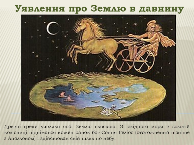 Уявлення про Землю в давнинуДревні греки уявляли собі Землю плоскою. Зі східного моря в золотій колісниці піднімався