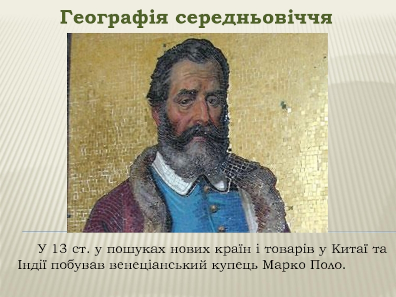 Географія середньовіччя	У 13 ст. у пошуках нових країн і товарів у Китаї та Індії побував венеціанський купець