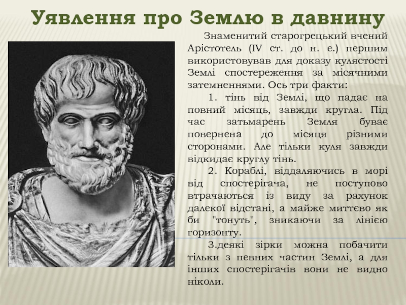 Уявлення про Землю в давнинуЗнаменитий старогрецький вчений Арістотель (IV ст. до н. е.) першим використовував для доказу
