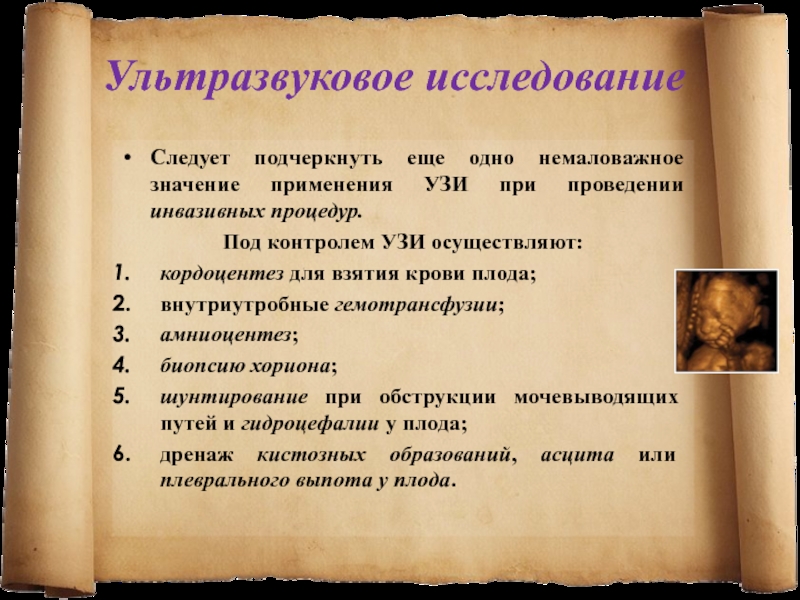 УЗИ является единственным неинвазивным методом оценки состояния плода при различных видах акушерской патологии, особенно в ранние сроки беременности.
