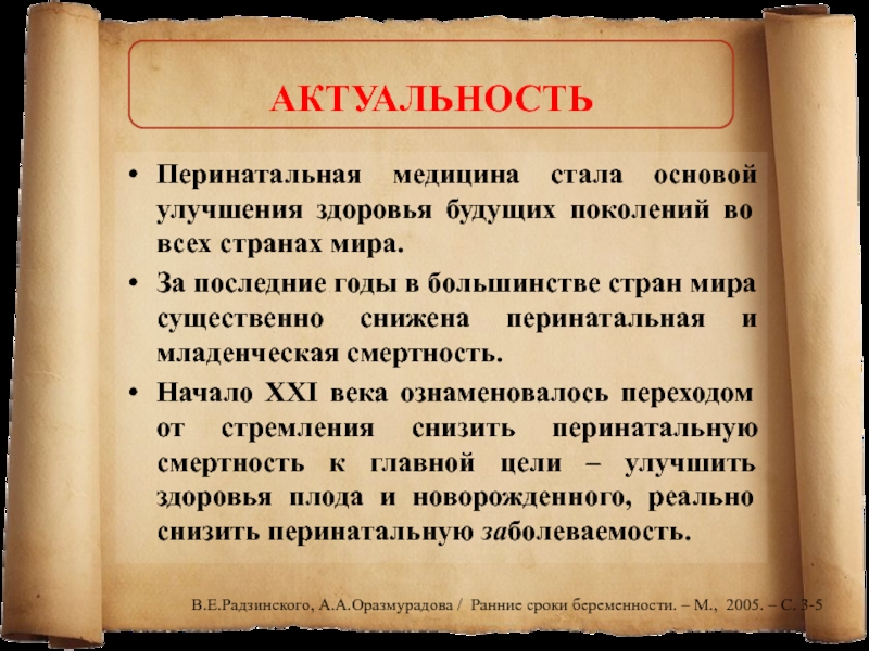 Начало XXI века ознаменовалось переходом от стремления снизить перинатальную смертность к главной цели – улучшить здоровья плода и новорожденного, реально снизить перинатальную заболеваемость.