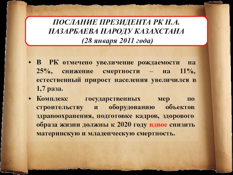 Слайд 13ПОСЛАНИЕ ПРЕЗИДЕНТА РК Н.А. НАЗАРБАЕВА НАРОДУ КАЗАХСТАНА