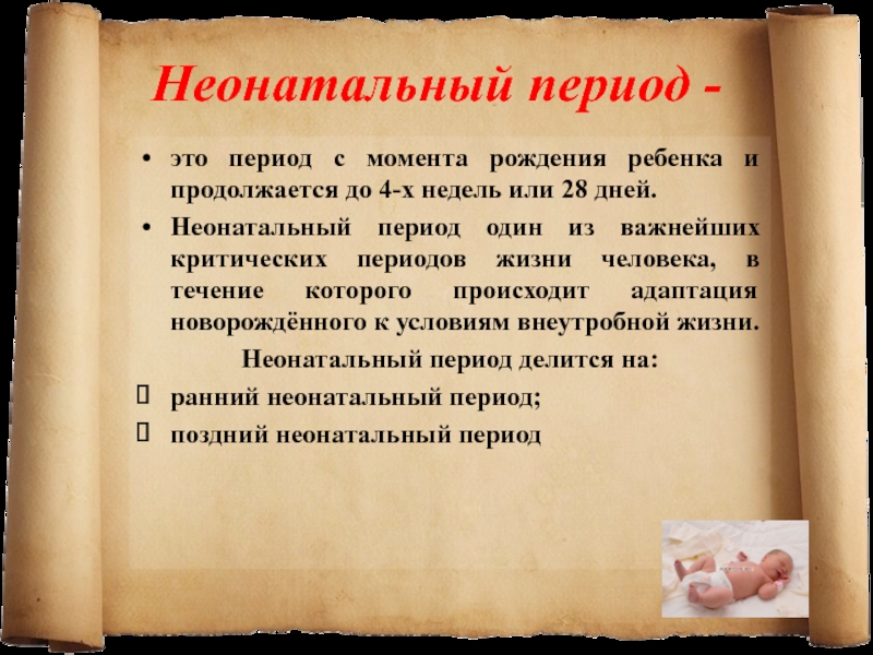 критических периодов жизни человека, в течение которого происходит адаптация новорождённого к условиям внеутробной жизни.