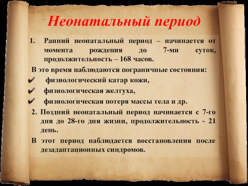 2. Поздний неонатальный период начинается с 7-го дня до 28-го дня жизни, продолжительность - 21 день.