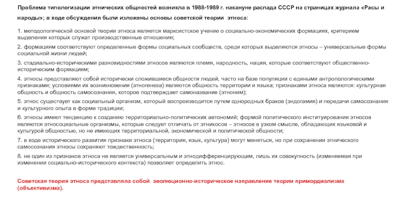 Слайд 5Советская теория этноса представляла собой эволюционно-историческое направление теории примордиализма (объективизма).