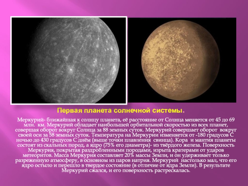 обладает наибольшей орбитальной скоростью из всех планет, совершая оборот вокруг Солнца за 88 земных суток. Меркурий совершает оборот вокруг своей оси за 58 земных суток. Температура на Меркурии изменяется от -180 градусов С ночью до 430 градусов С днём (выше точки плавления свинца). Кора и мантия планеты состоят из скальных пород, а ядро (75% его диаметра)- из твёрдого железа. Поверхность Меркурия, покрытая раздробленными породами, изрыта кратерами от ударов метеоритов. Масса Меркурия составляет 20% массы Земли, и он удерживает только разреженную атмосферу, в основном из паров натрия. Меркурий настолько мал, что его ядро остыло и перешло в твердое состояние (в отличие от ядра Земли). В результате Меркурий сжался, и его поверхность растрескалась.