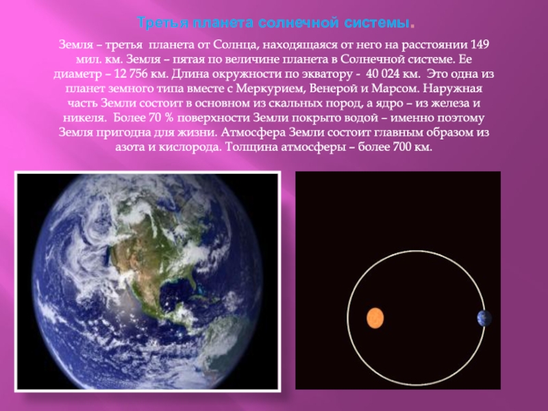 по величине планета в Солнечной системе. Ее диаметр – 12 756 км. Длина окружности по экватору - 40 024 км. Это одна из планет земного типа вместе с Меркурием, Венерой и Марсом. Наружная часть Земли состоит в основном из скальных пород, а ядро – из железа и никеля. Более 70 % поверхности Земли покрыто водой – именно поэтому Земля пригодна для жизни. Атмосфера Земли состоит главным образом из азота и кислорода. Толщина атмосферы – более 700 км.