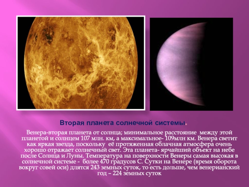 км. Венера светит как яркая звезда, поскольку её протяженная облачная атмосфера очень хорошо отражает солнечный свет. Эта планета- ярчайший объект на небе после Солнца и Луны. Температура на поверхности Венеры самая высокая в солнечной системе - более 470 градусов С. Сутки на Венере (время оборота вокруг совей оси) длятся 243 земных суток, то есть дольше, чем венерианский год – 224 земных суток