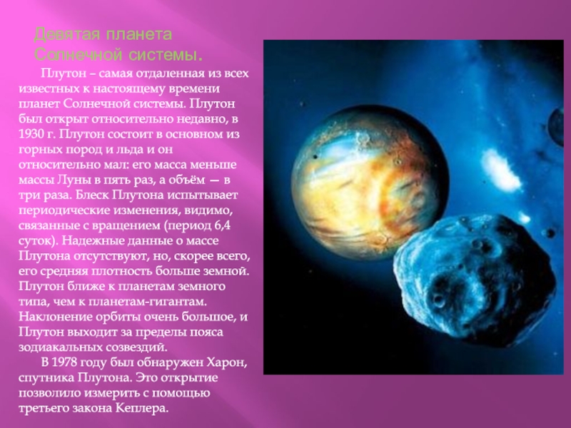 Плутон был открыт относительно недавно, в 1930 г. Плутон состоит в основном из горных пород и льда и он относительно мал: его масса меньше массы Луны в пять раз, а объём — в три раза. Блеск Плутона испытывает периодические изменения, видимо, связанные с вращением (период 6,4 суток). Надежные данные о массе Плутона отсутствуют, но, скорее всего, его средняя плотность больше земной. Плутон ближе к планетам земного типа, чем к планетам-гигантам. Наклонение орбиты очень большое, и Плутон выходит за пределы пояса зодиакальных созвездий.