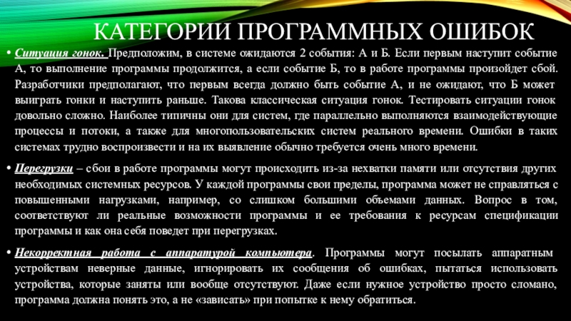 а если событие Б, то в работе программы произойдет сбой. Разработчики предполагают, что первым всегда должно быть событие А, и не ожидают, что Б может выиграть гонки и наступить раньше. Такова классическая ситуация гонок. Тестировать ситуации гонок довольно сложно. Наиболее типичны они для систем, где параллельно выполняются взаимодействующие процессы и потоки, а также для многопользовательских систем реального времени. Ошибки в таких системах трудно воспроизвести и на их выявление обычно требуется очень много времени.
